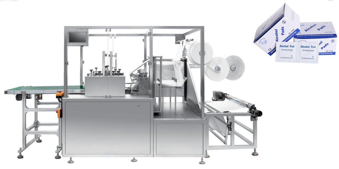 負荷の8 non-woven rolls→folding→cutoff→wetting→sealing→bagはコンベヤー ベルトによって→outputを断ち切った。